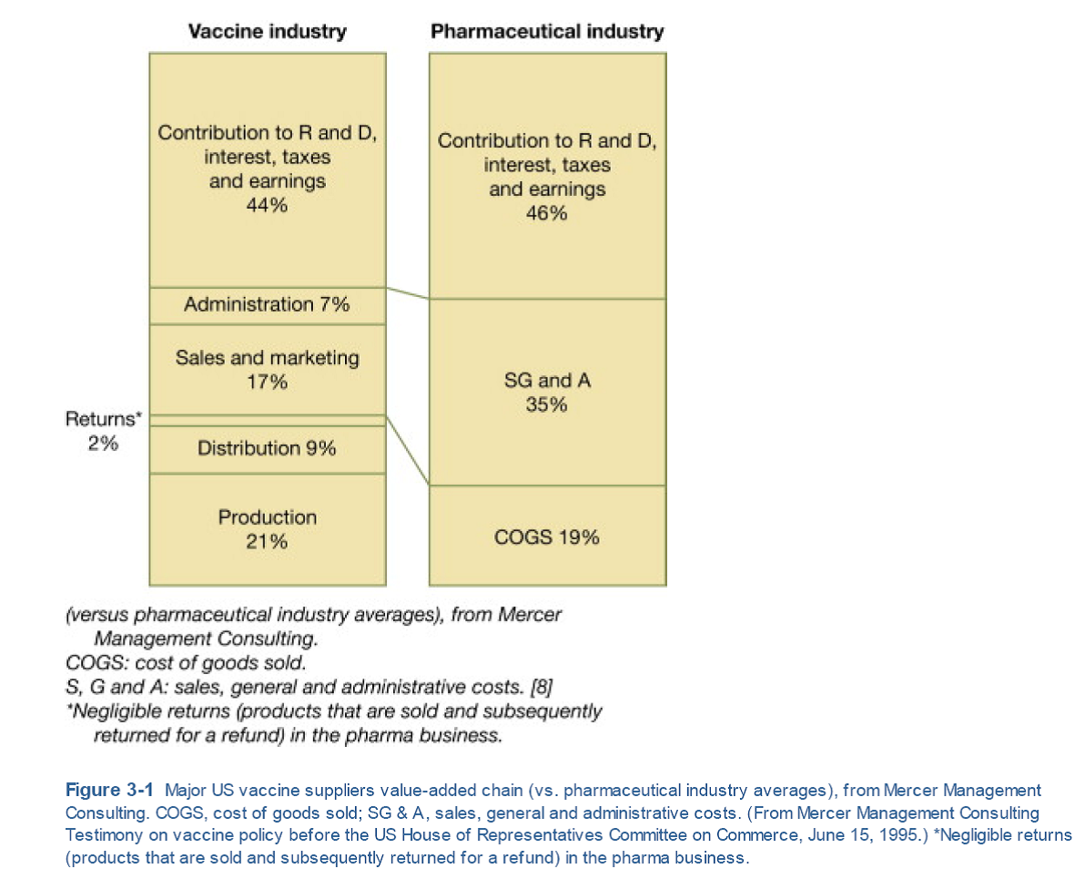 在美國的調(diào)查結(jié)果表明,這兩個產(chǎn)業(yè)在研發(fā)投入、利息、稅收、扣除成本后的收益等方面非常接近( 分別為44%和46% )。然而成本方面相差非常大,其中疫苗產(chǎn)業(yè)在生產(chǎn)和分銷(包括產(chǎn)品的生產(chǎn)、分銷和退貨) 方面的成本(32% )顯著高于制藥產(chǎn)業(yè)(19%),而后者在銷售、市場和管理方面的成本則高于疫苗產(chǎn)業(yè)( 分別為35% 和24% )。