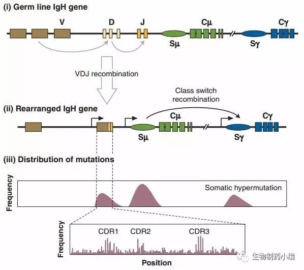 BCR基因重排后的成熟B細(xì)胞受到抗原刺激后,會(huì)于生發(fā)中心發(fā)生重鏈和輕鏈V區(qū)的高頻率突變(主要是點(diǎn)突變),之后再經(jīng)過(guò)FDC捕獲抗原使表達(dá)高親和力BCR的B細(xì)胞免于凋亡。這一過(guò)程使得后代B細(xì)胞的BCR對(duì)抗原的平均親和力得到提升。這樣的體細(xì)胞高頻突變屬于二次免疫應(yīng)答,幫助可有效識(shí)別抗原的抗體進(jìn)一步成熟,有助于機(jī)體有效抵抗外來(lái)抗原的再次入侵。