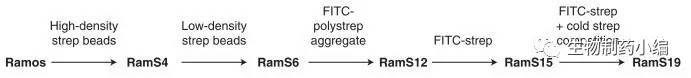 Ramos是來(lái)源于人Burkitt淋巴瘤的一株細(xì)胞系,在培養(yǎng)過(guò)程中其重排后的免疫球蛋白V區(qū)基因持續(xù)發(fā)生組成型突變,并表達(dá)到膜表面。早在2002年Sarah等人就報(bào)道了利用Ramos細(xì)胞系篩選出對(duì)鏈霉親和素有高親和力的IgM[2]。他們將鏈霉親和素結(jié)合到磁珠上,從一群Ramos細(xì)胞中篩出對(duì)鏈霉親和素有低親和力的細(xì)胞群,之后降低磁珠上的鏈霉親和素的密度以提高篩選的苛刻程度,進(jìn)一步篩出親和力更高的突變。之后又進(jìn)一步用標(biāo)記FITC熒光的鏈霉親和素結(jié)合流式分選將抗體親和力進(jìn)一步提高。